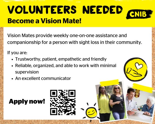 For more information about the program or about volunteering with CNIB, please see our Vision Mate volunteer recruitment ad here: Vision Mate Volunteering | CNIB, or contact us at 1-800-563-2642.