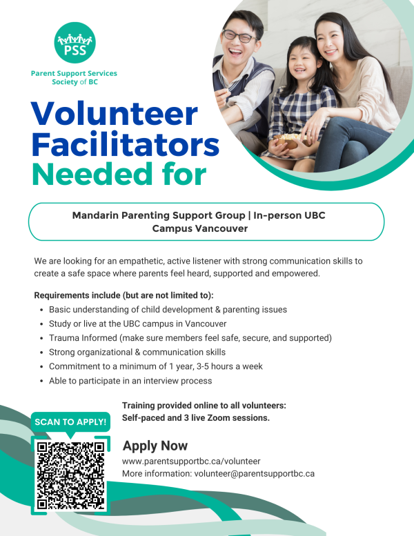 The volunteer Facilitator will provide support to parents and caregivers through our Parenting Support Group. The group is run by two co-facilitators who are trained and supported by PSS staff and by other volunteers. Our groups are base on self-help, peer support model which provides a safe space for Group members to get together and discuss their strengths, challenges or concerns about parenting role of the child development and parenting. The Group meet once a week, 2 hours in person/online. Day time. The duties of the Volunteer Facilitator is facilitate group discussions, contact new referrals and do the intake. Assist with the financial aspect of the group. Submit assistance and financial reports at the end of the month. Attend monthly Steering Committee and Facilitator support meetings. Participate in ongoing PSS training and workshops. Supply the group with information on community resources.